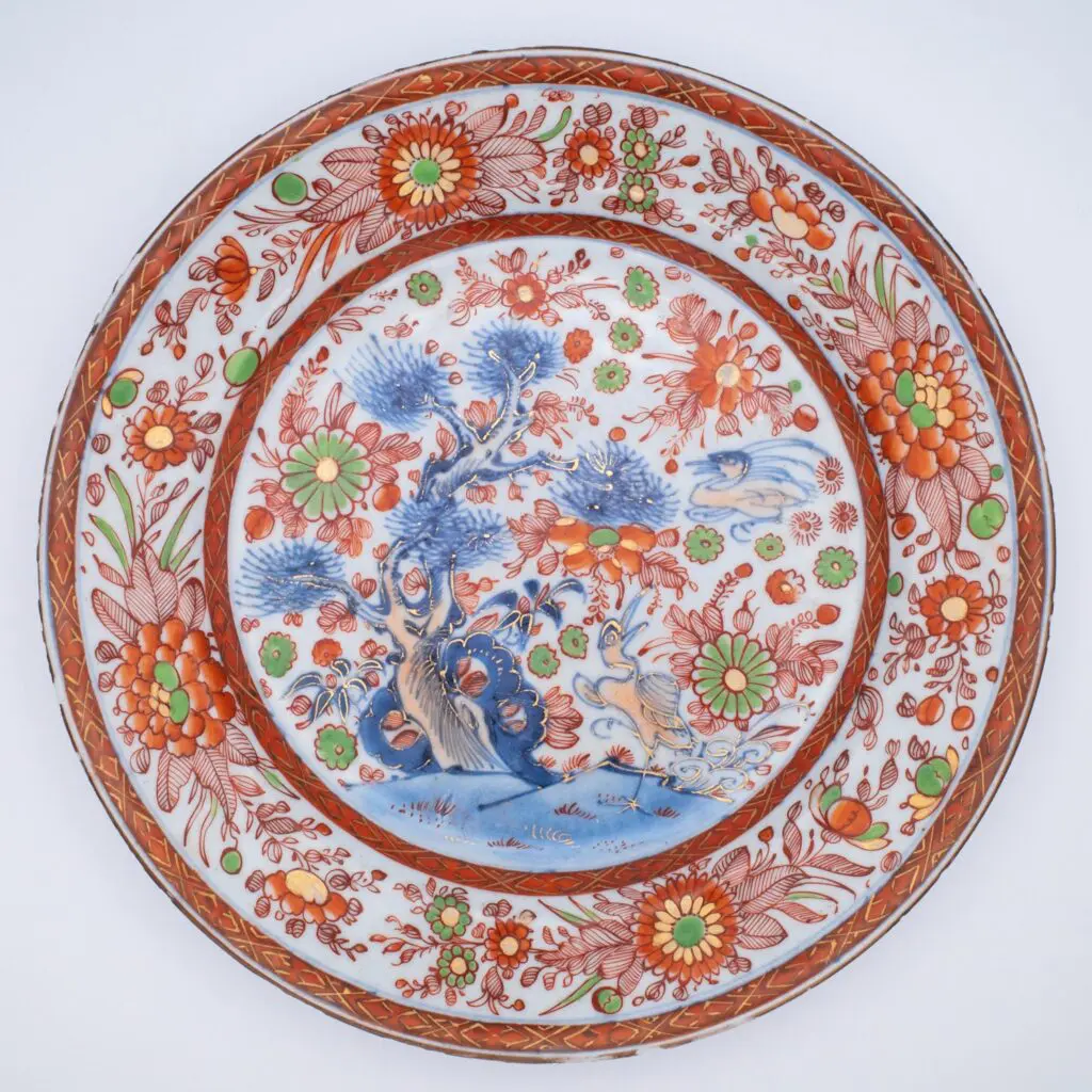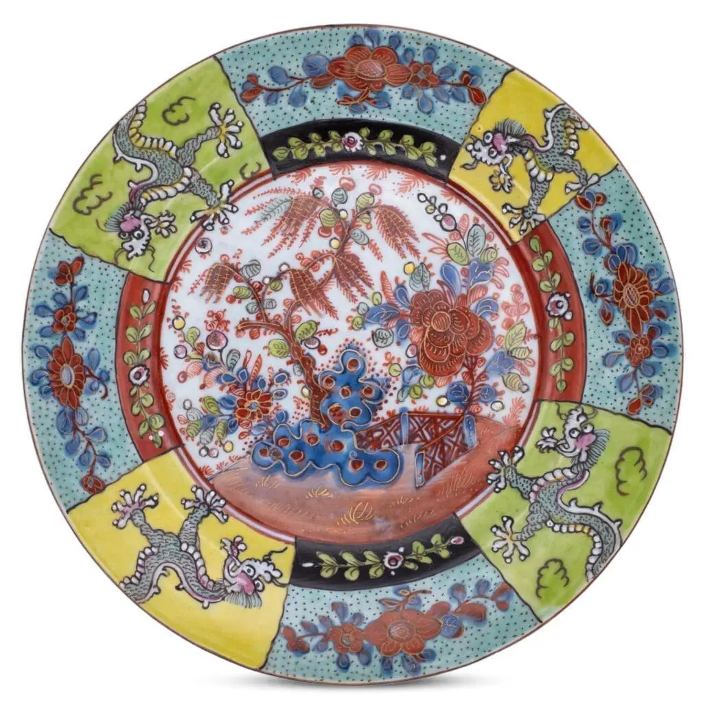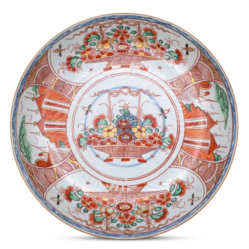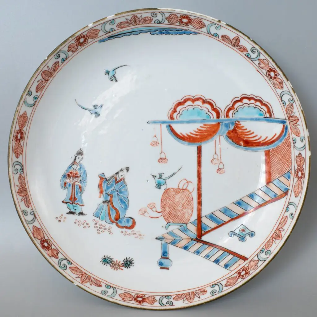 Early 18th century Chinese ‘Amsterdams Bont’ clobbered Kangxi an hua porcelain dish – this type of Chinese porcelain decorated in the Netherlands was a response to great popularity of Imari porcelain during the 18th century. Simple blue and white porcelain could have been bought for low prices, decorated with overglaze enamels similar to those of imari porcelain and then sold for a much higher price. Decoration sometimes featured scenes with European figures and architecture.
