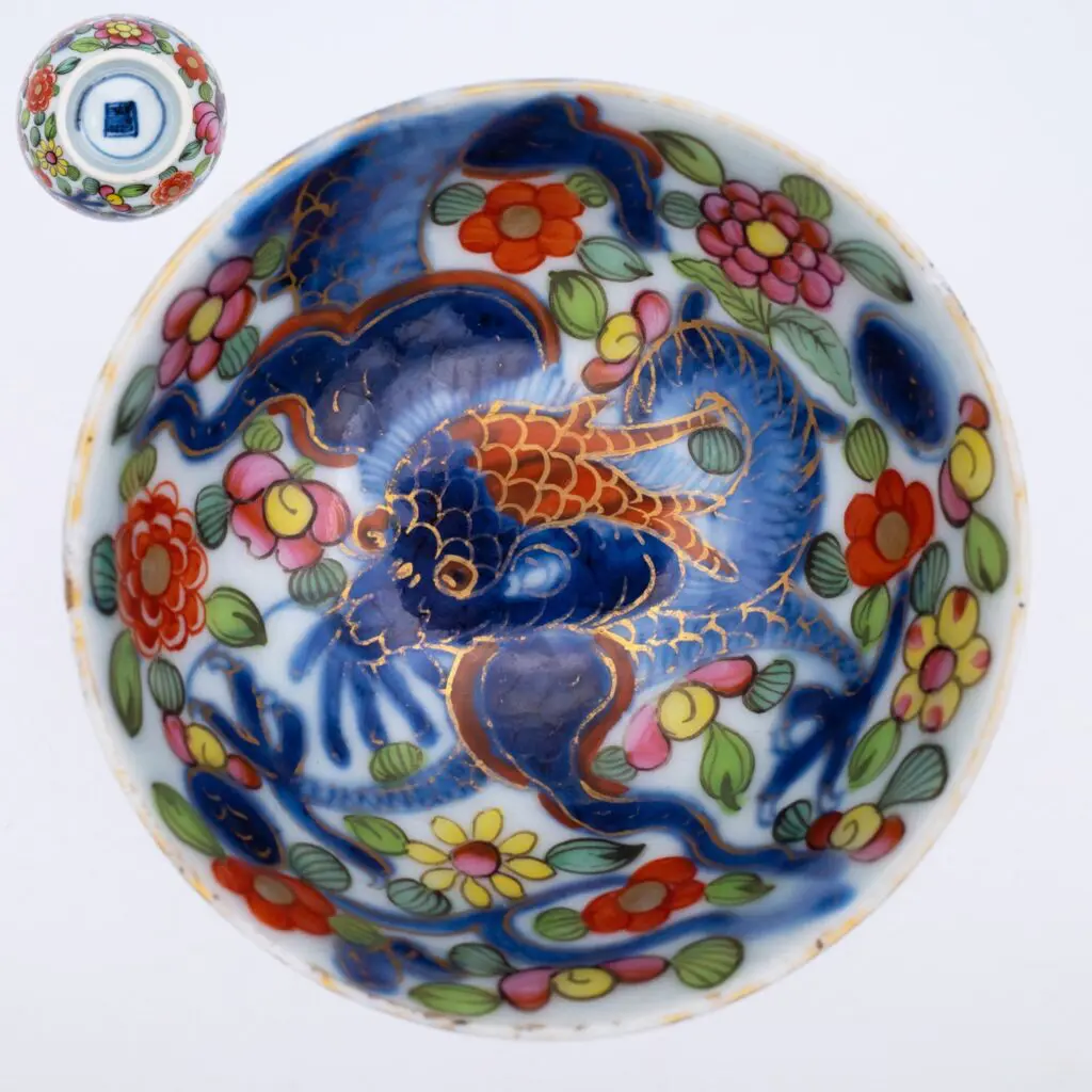 This one is even more unique as the original Chinese dish is decorated in overglaze Famille rose enamels rather than usual underglaze blue.