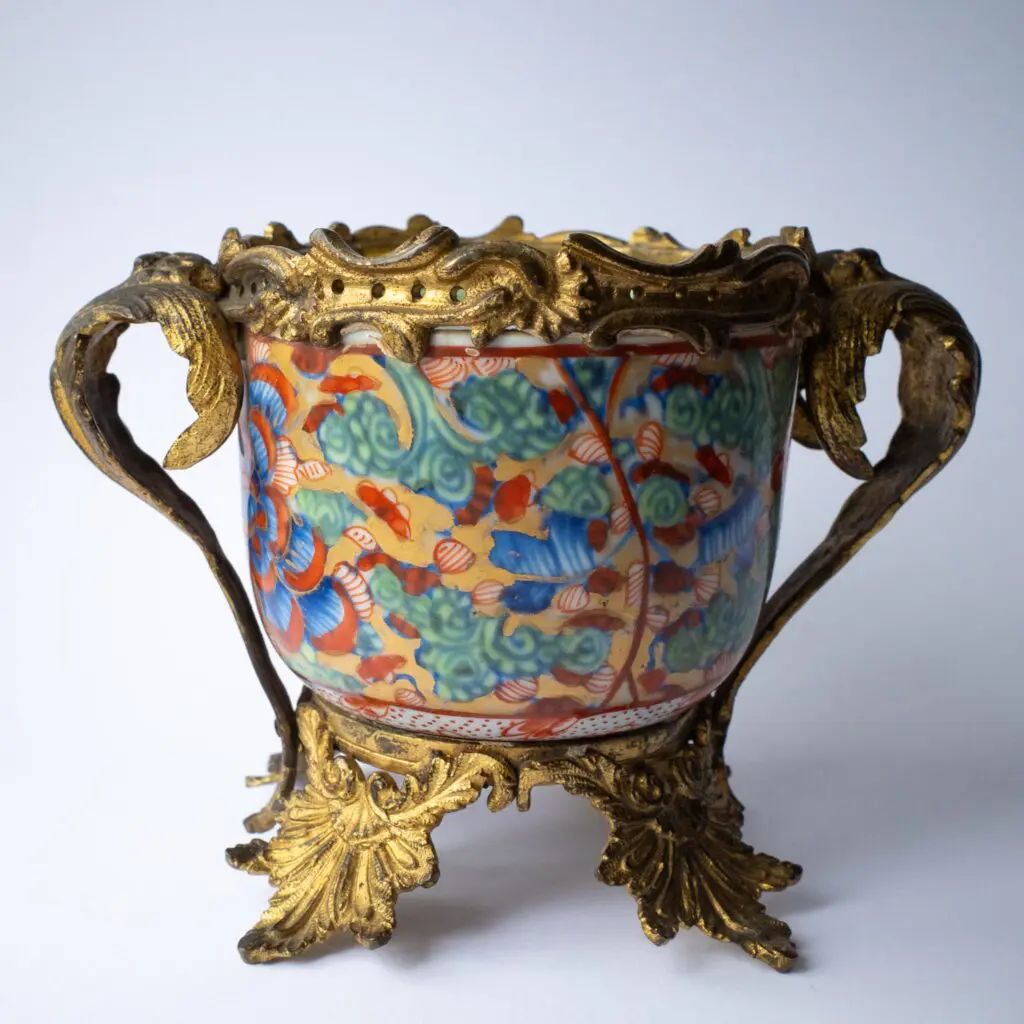 Rare antique Chinese blue and white porcelain pot with later European polychrome overglaze decoration and ormolu mounts. Base marked with typical iron red pseudo-Chinese mark.