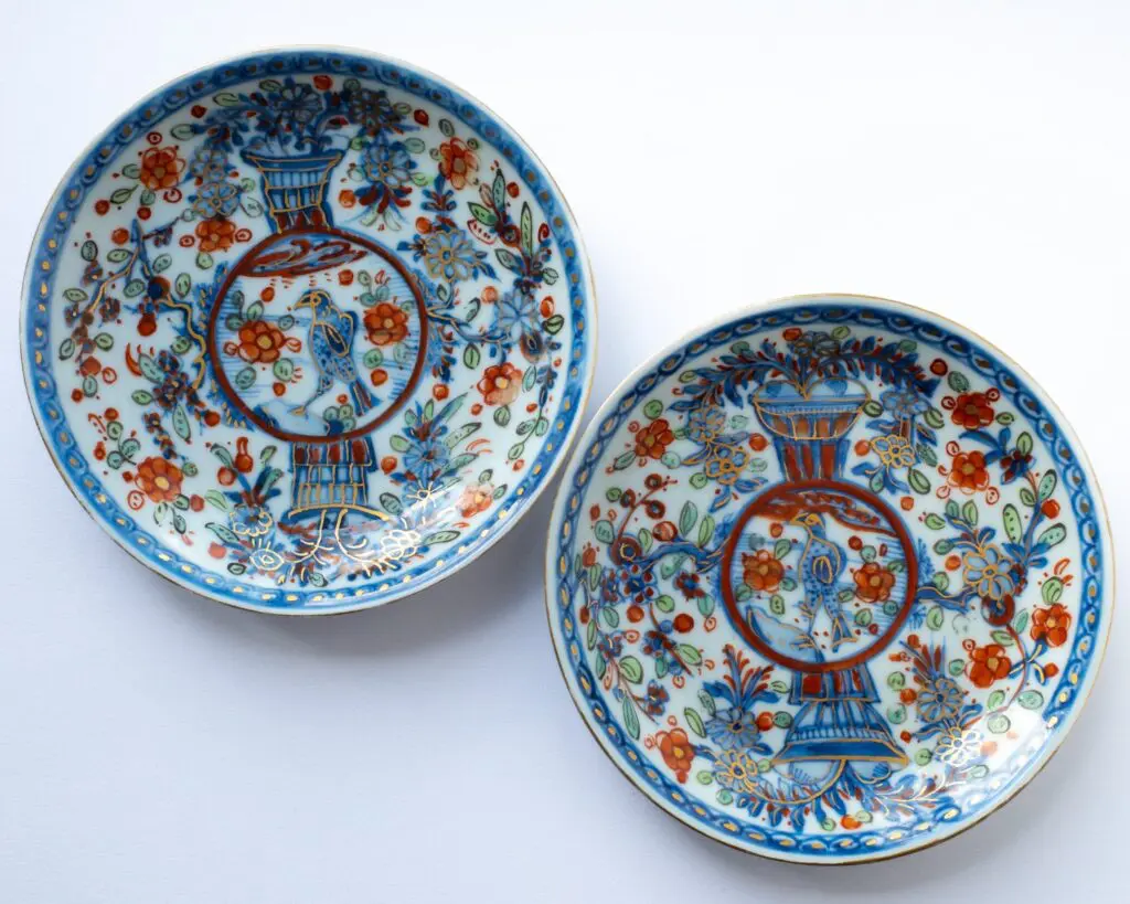 Blue and white porcelain saucers featuring central medallions with a bird perched on a rock, surrounded by various flowers all around. Polychrome overglaze decoration added later in Europe. Bases marked with typical rectangular iron red pseudo-Chinese marks.